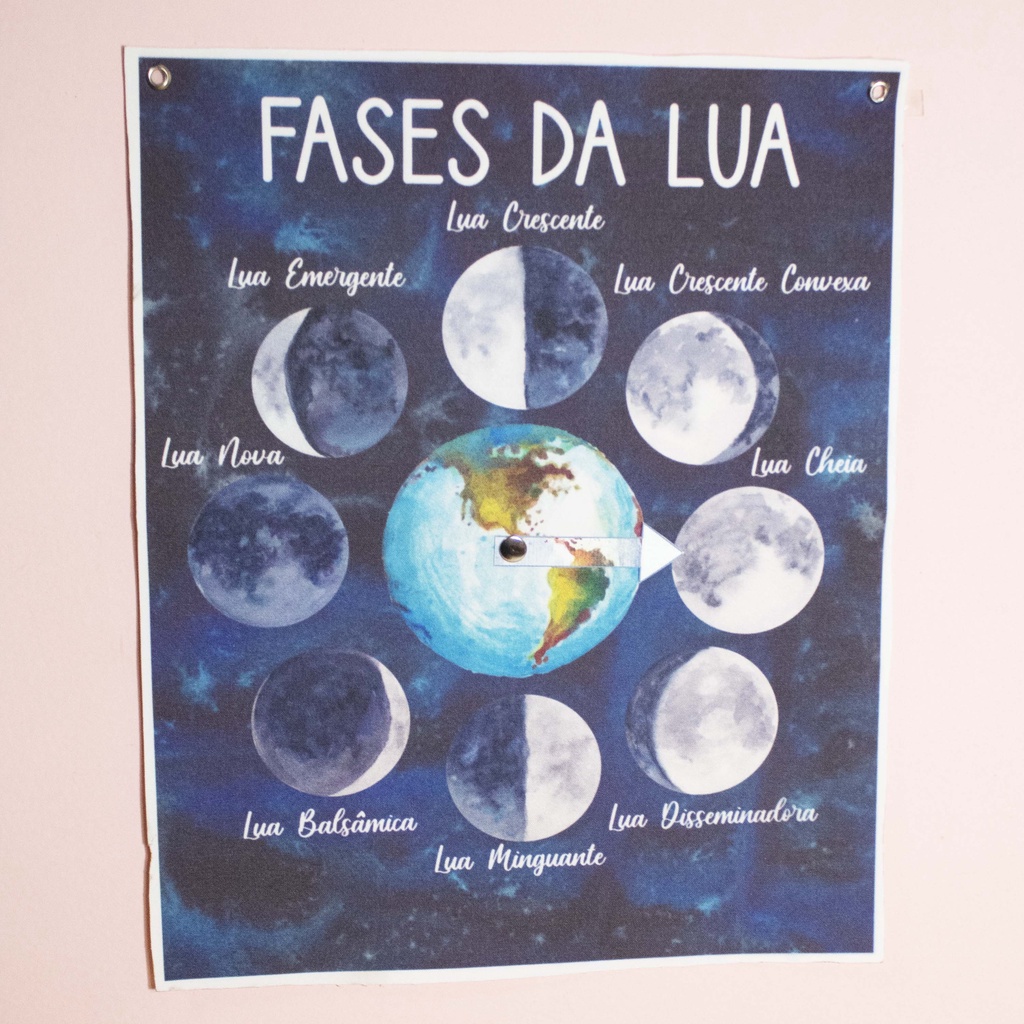 Desenvolvido para enfeitar o Cantinho de estudo com tema Fases da Lua. Incentivar a criança a observar a lua e apontar com a seta a fase que se encontra. Manipulável com seta.