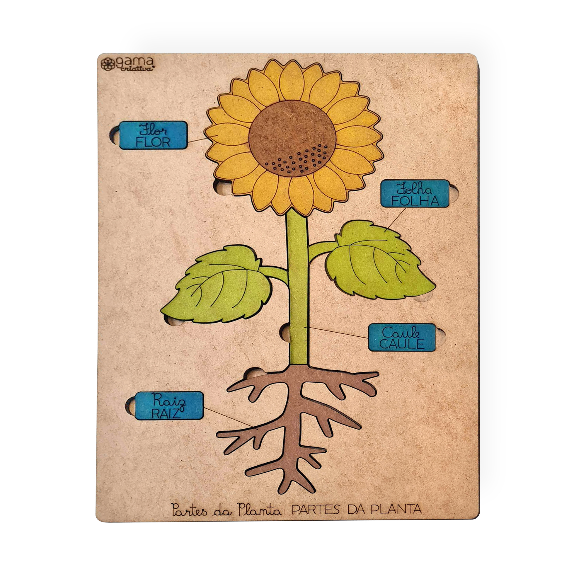 composto por uma base com 9 peças das partes da planta: flor, caule, folha e raiz.