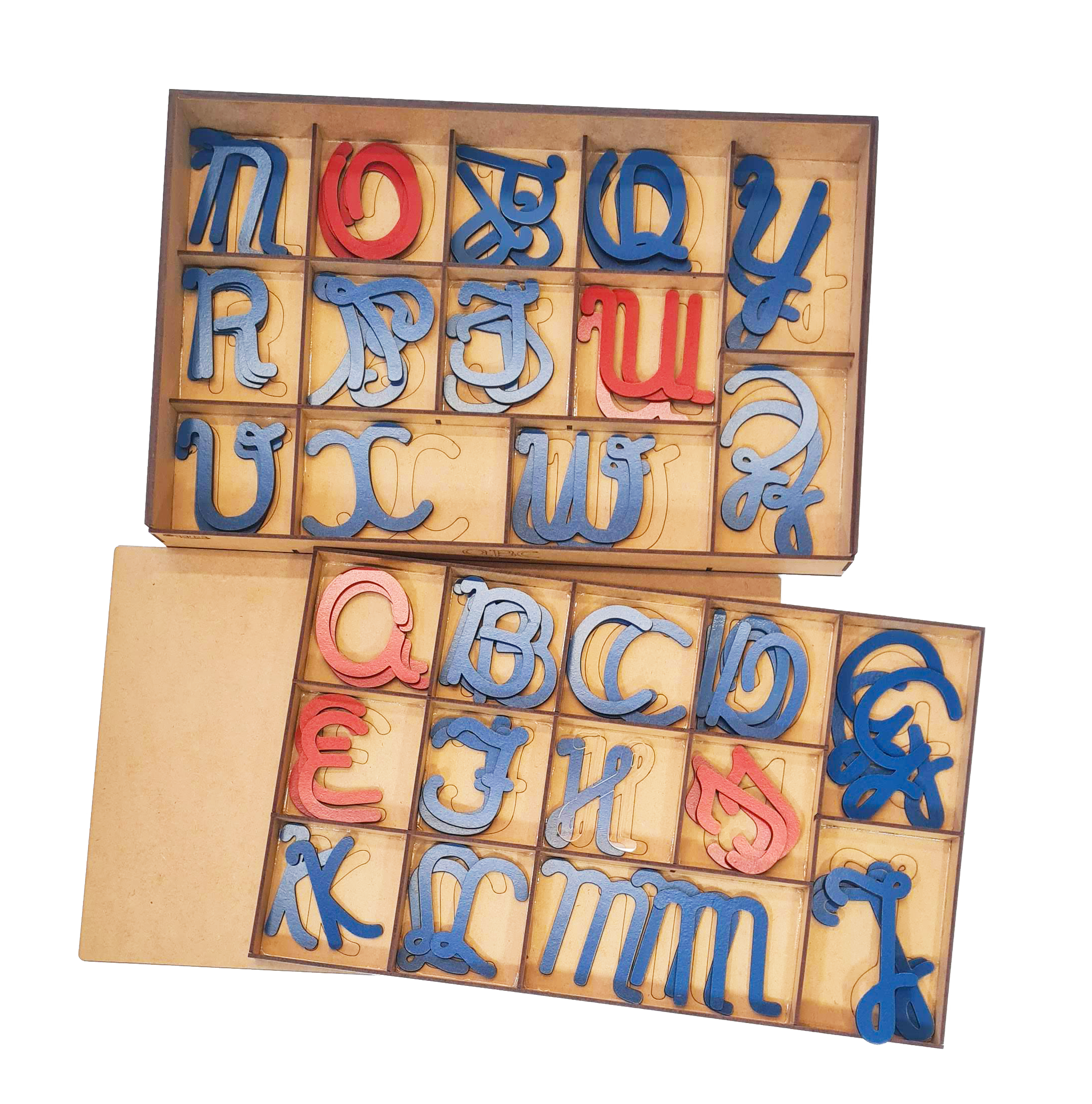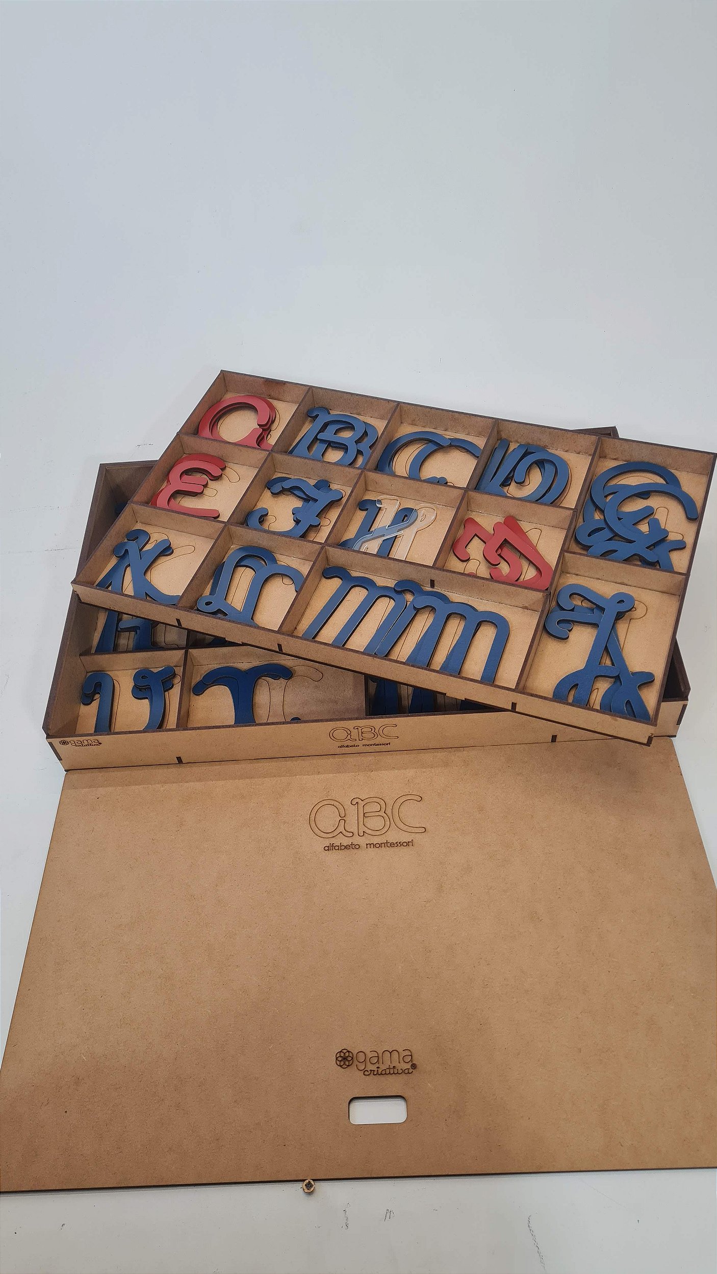 Todos os alfabetários acompanham caixa de MDF com divisória proporcional para cada letra.