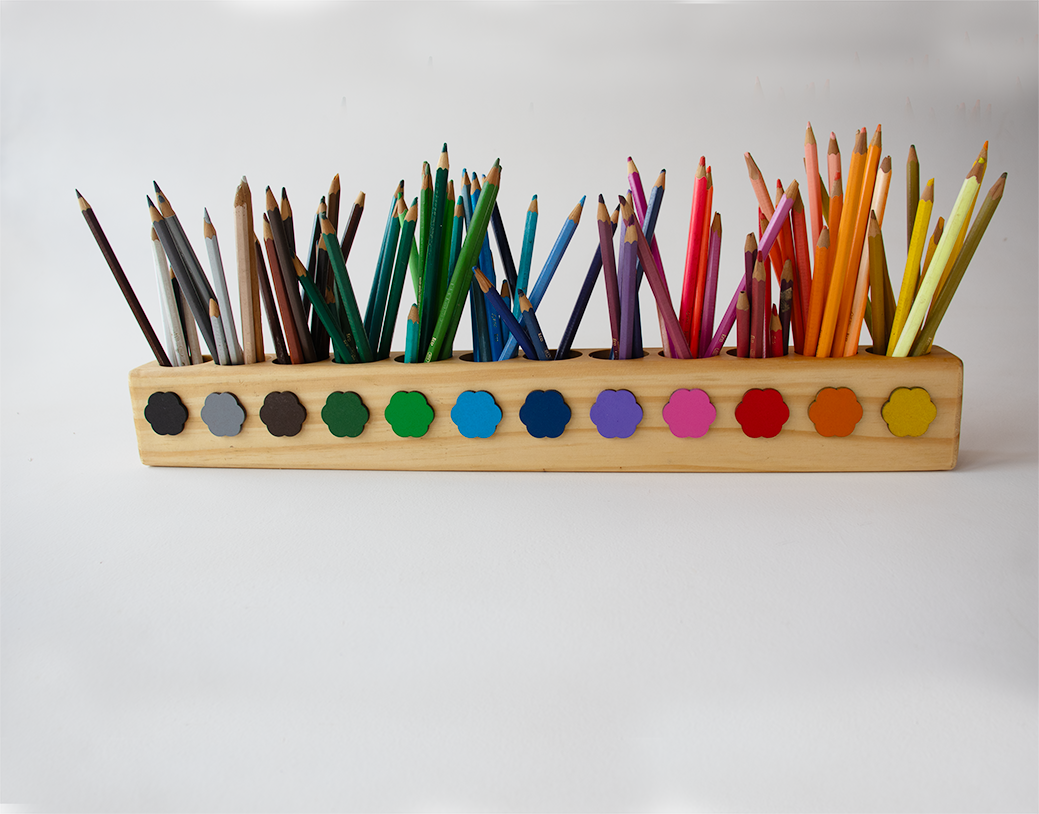 Com inspiração montessoriana, separar os lápis por cores deixa mais bonito e organizado, tornando as atividades mais atrativas.